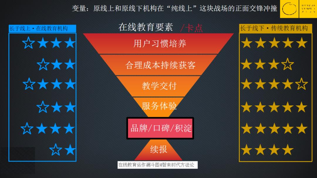 第五个卡点,品牌和口碑的积淀。教育行业是个慢活,很多线下的地方龙头机构都是20年以上的老机构,20年都没死掉,凭什么它明年就会死掉呢?20年可以影响一代人,教育了一代人,这将形成很强的客户心智占据。现在的在线教育机构基本上没有维持这么长时间,五年已经算是老牌机构了,因此在口碑和沉淀上面,线下教育机构转到线上后,其品牌信任度、口碑积淀仍然是有优势的。