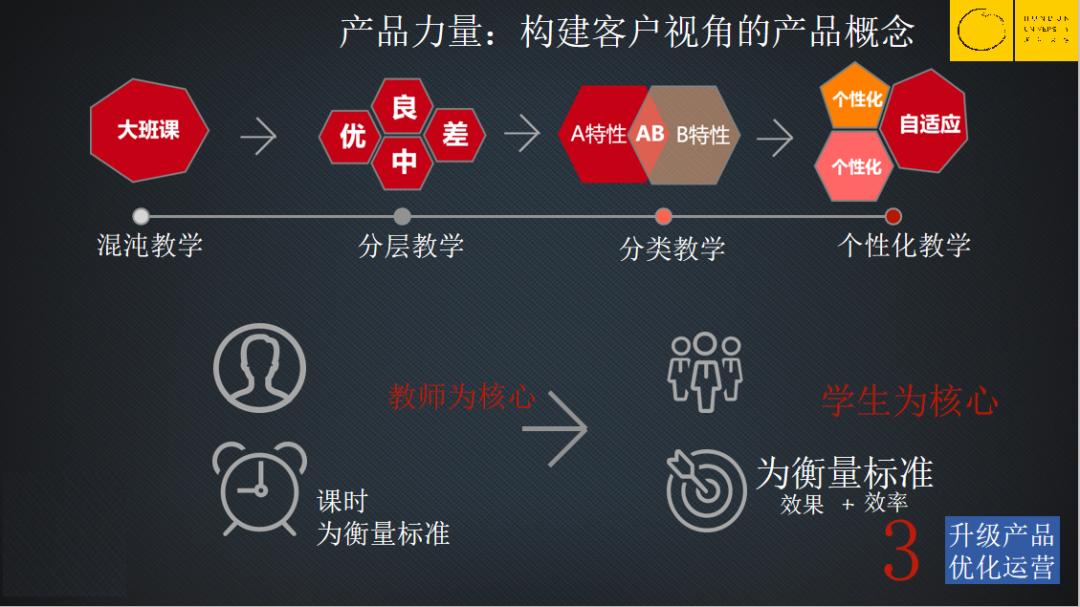 机构不再跟客户说1万块钱可以买某位名师的100个课时,而变成了1万块钱交给我,我在最短的时间之内给你解决什么问题,让你提多少分,让你记多少个单词、掌握多少知识点——这些都是换位到以学生为核心,以效果和效率为考核标准的,这是一个完全不同的思路,对产品研发、教学场景和运营服务改造有巨大的挑战。