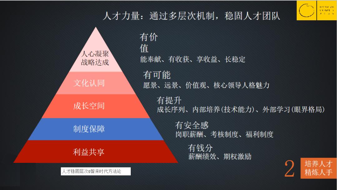 第一层是做利益共享,就是跟有钱分,需要做的事情是薪酬绩效、期权激励。
