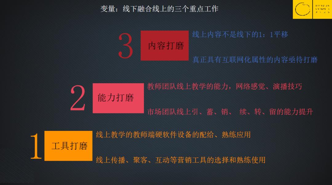 我们给各位的建议,是要迎合我们教育培训行业的大变量,线下融合线上,建议大家抓住三个重要的工作: