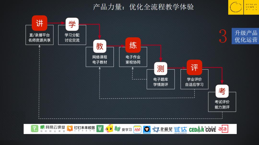 4、 谁能构建新生态下的新产品形态,谁就把握了教育机构的核心力量——构建在新生态下的大产品格局概念,讲、学、教、练、测、评、考全流程的构建。