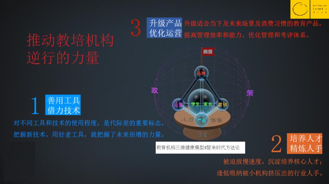 最后,大家回想一下前面提到的教育机构三维健康模型——产品立足、运营拉动、营销推动……那些,就是我们教育培训行业最重要的核心力量。