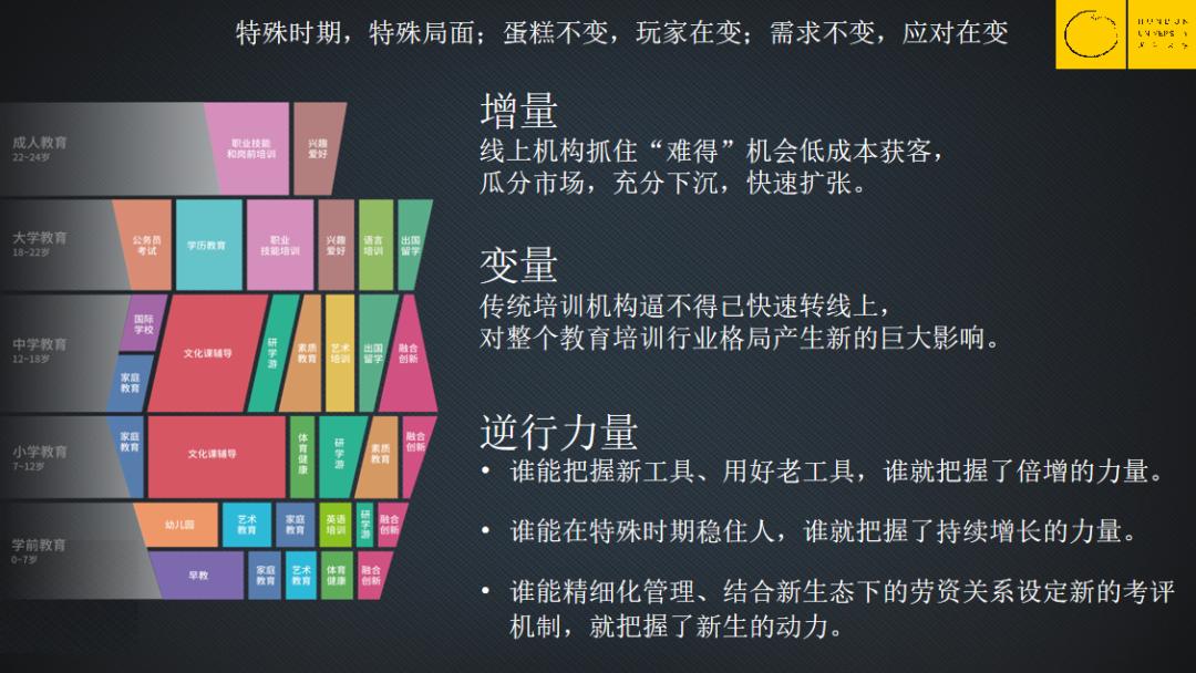 在这个特殊时刻,整个民办教育培训行业的蛋糕是不变甚至变小的,因为消费者的钱袋子紧了,那么教育培训上的预算也会有所收缩了,所以总体市场规模有可能有所下滑。市场中的玩家也在变,更多新的巨头玩家开始入场。而消费者需求是不变的——他们对学习的效果和效率的要求一直不变——只是教育机构的应对要进行同步的调整。