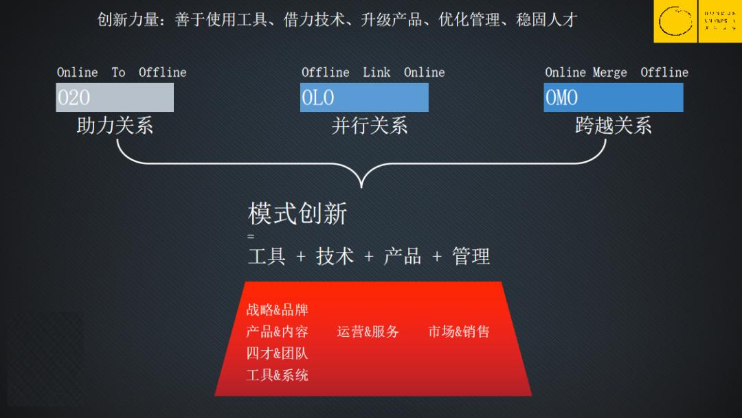 现在提出的OMO——线上线下融合,是跨越关系。教学场景跨越、教学服务跨越,线上线下的边界模糊了,线上团队和线下团队的职能也不再这么泾渭分明的区分了。因此,OMO最重要的是模式的创新和跨越。