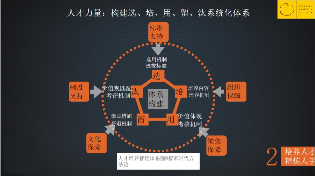 这个常规观念我就不多说了,直说一头一尾——选的过程中要有标准支持,包括选用机制(外部员工录用)和选拔机制(内部员工擢升);汰则是靠两个关键点来淘汰的,一个是合理的考评机制,另一个很重要的是价值观。在教育行业,价值观不匹配,再厉害,对企业而言也不是人才,只能是人手,甚至某些时候对企业而言是人渣,必然要淘汰。