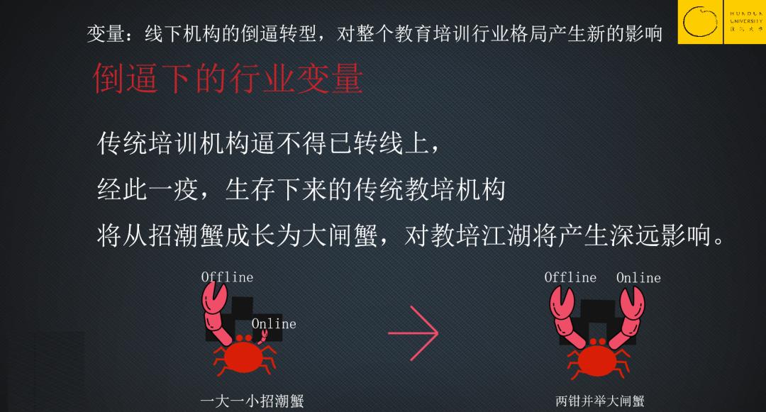 除了在线教育机构“借疫”快速做增量之外,真正影响教培江湖的变量,是原来做线下的辅导机构都被逼快速转为线上。经过了这次战役,生存下来的传统教培机构将从一支钳子大(线下强大)、一支钳子小(线上弱小)的招潮蟹,变成两个钳子一样粗壮强大(线上线下并行),两钳并举的大闸蟹。