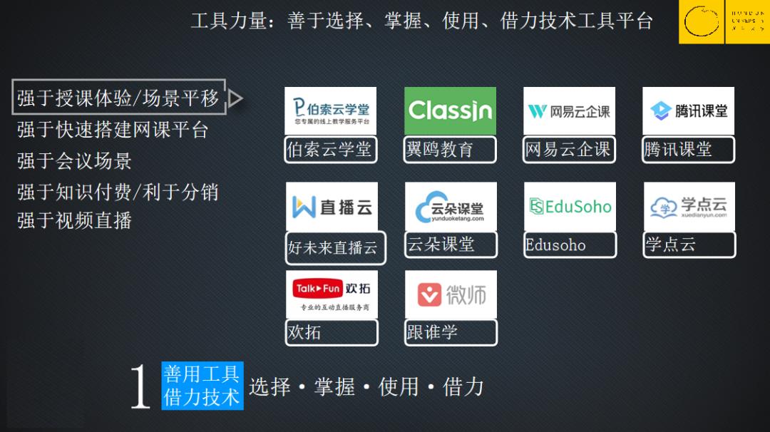 简单总结,推动教育培训机构,尤其是传统教育机构在疫情期间能够逆行的力量,就是——善用工具,借力技术;升级产品,优化管理;稳固人才,精炼人手。