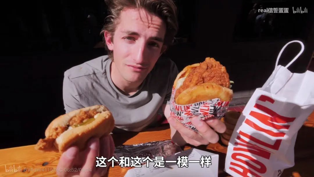 他发现,一家网红炸鸡餐饮店出售的炸鸡汉堡包,竟更像肯德基官方海报上的汉堡。满满的吐槽和体验,让这条视频很快出圈,至今这条视频的点击量已经达712.8万。
