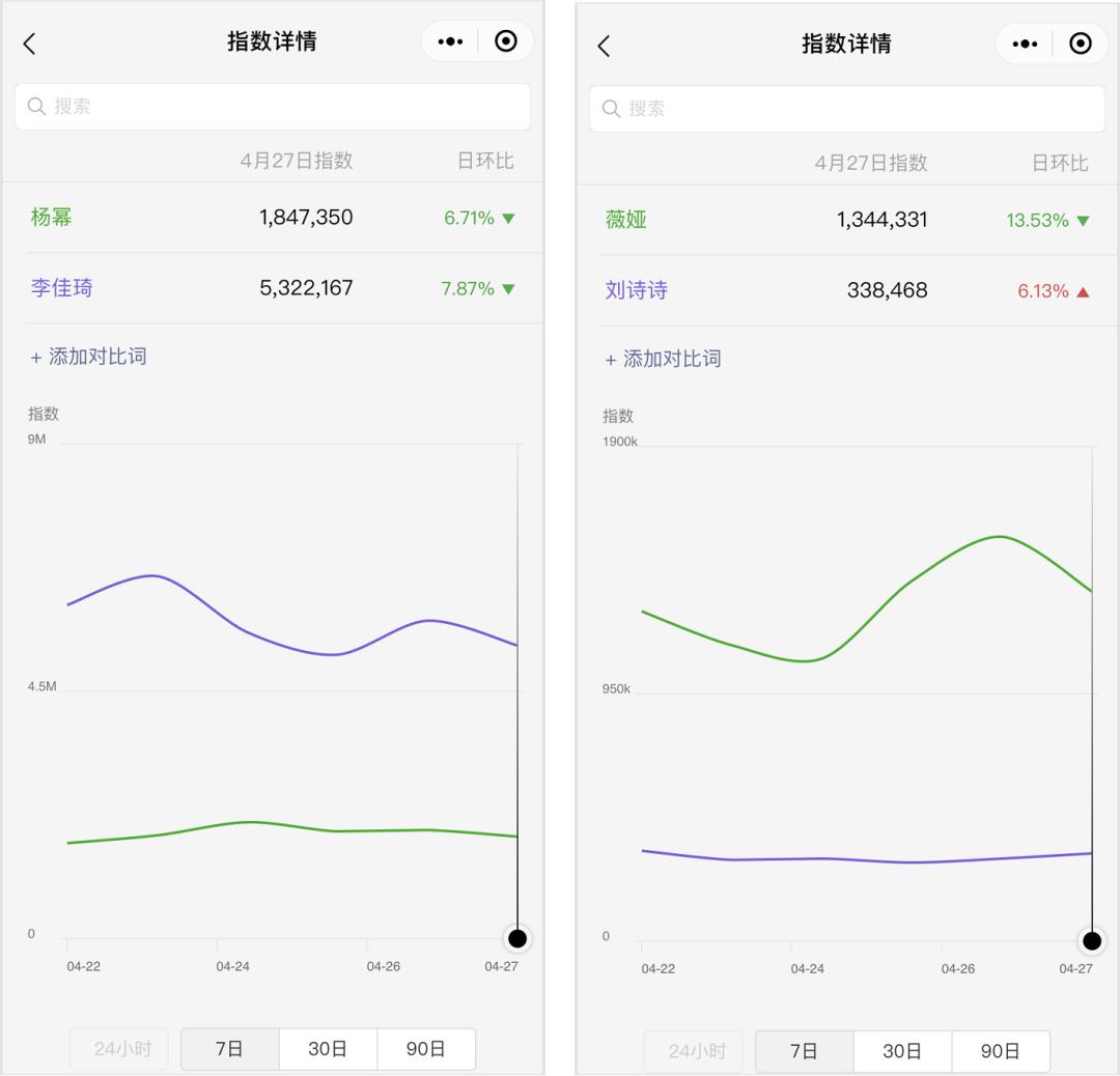 比如,李佳琦的微信指数甚至超过了“话题女王”杨幂,薇娅也稳稳的超过了一线女星刘诗诗(仅微信数据,不代表其他平台)。