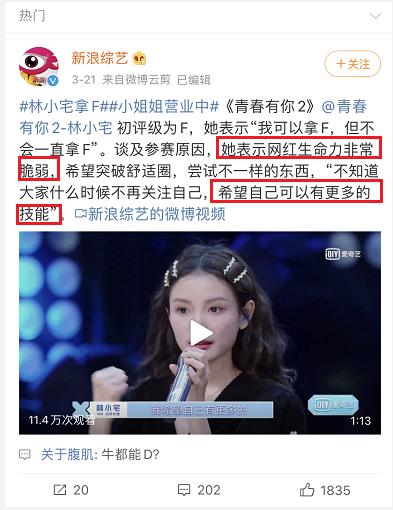 比如,拥有 1000w+ 的网红 @林小宅 ,最近去参加了综艺《青春有你》,和 109 位练习生同台竞争 9 个出道位;