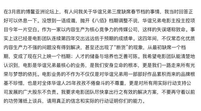 2019年过去后,华谊将反省视角放在了内部。在华谊2019年王中磊致全体员工的一封信中,在分析了实景娱乐品牌授权、国家化战略以及各部门情况之后,王中磊表示,“事实上这已经是电影团队连续第四年交出远远低于预期的成绩单。这四年间,不仅常态化优质内容生产力不强的问题没有得到解决,甚至还出现了‘断货’的现象,从最初缺席一个档期,变成了现在只上映一个档期;人才的储备与培养也乏善可陈。”