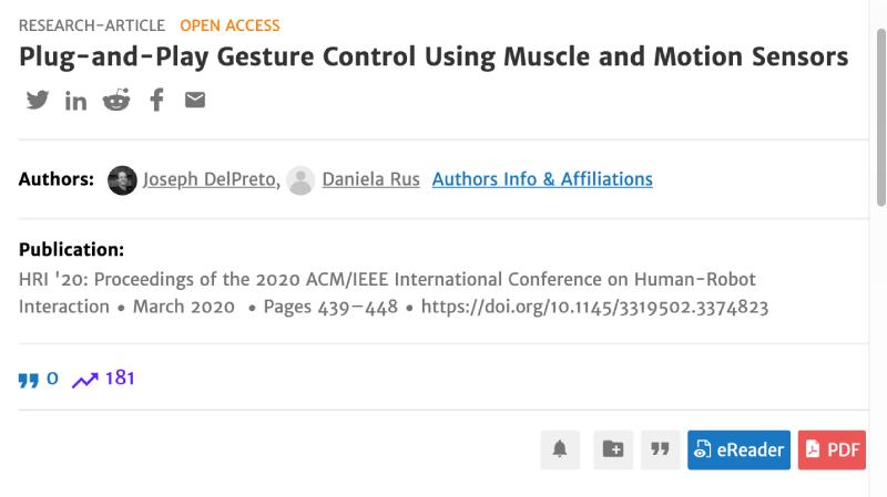 论文发表在计算机学术网站ACM Digital Library上,论文题目为《使用肌肉和动作传感器实现即插即用手势控制(Plug-and-Play Gesture Control Using Muscle and Motion Sensors)》。