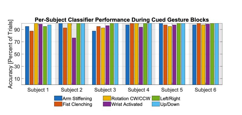 在测试阶段,研究人员按照这样的顺序给出指令:转动,手臂僵直,向上、下、右握拳,向左握拳。分类器优先按照最近0.2s内检测到的手势做出反应,其次按照根据肌电信号预测到的运动意图做出反应。