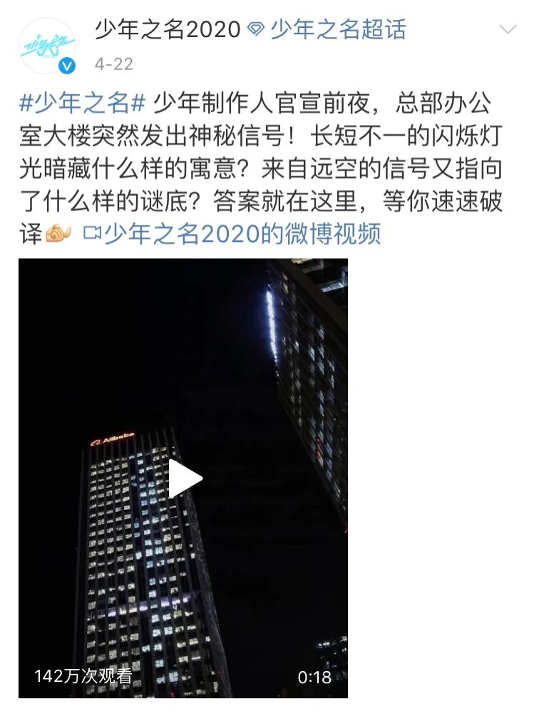 《少年之名》导师官宣,用了一整栋的灯闪大玩摩斯密码。评论区里,粉丝们用大量的摩斯密码为爱豆打CALL,并用牛仔裤的符号“裤”来直呼优酷。相比较隔壁桃和鹅,这应该算是网友们首次比较大规模地用 “裤”代替优酷。尽管只是一个称谓,但那个氛围开始对了。