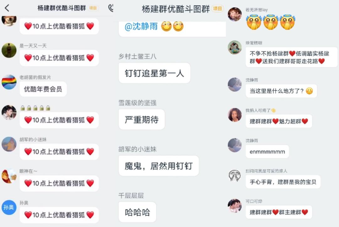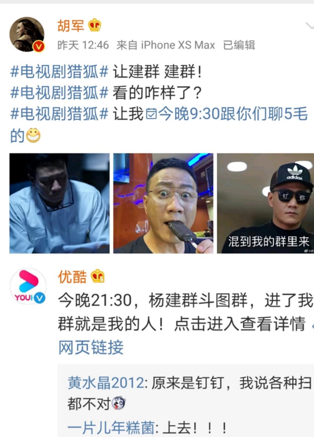 在这个“杨建群优酷斗图群”里,首次成为钉钉群主的胡军,又是唱歌又是和一众00后大玩表情包斗图,而00后的彩虹屁也给足胡军排面。这一波骚操作,让《猎狐》在00后心里打上了“优酷独家播出“的标签。网娱君温馨提示,00后进群需谨慎啊,毕竟进了裤的群,就是裤的人了。(笑)