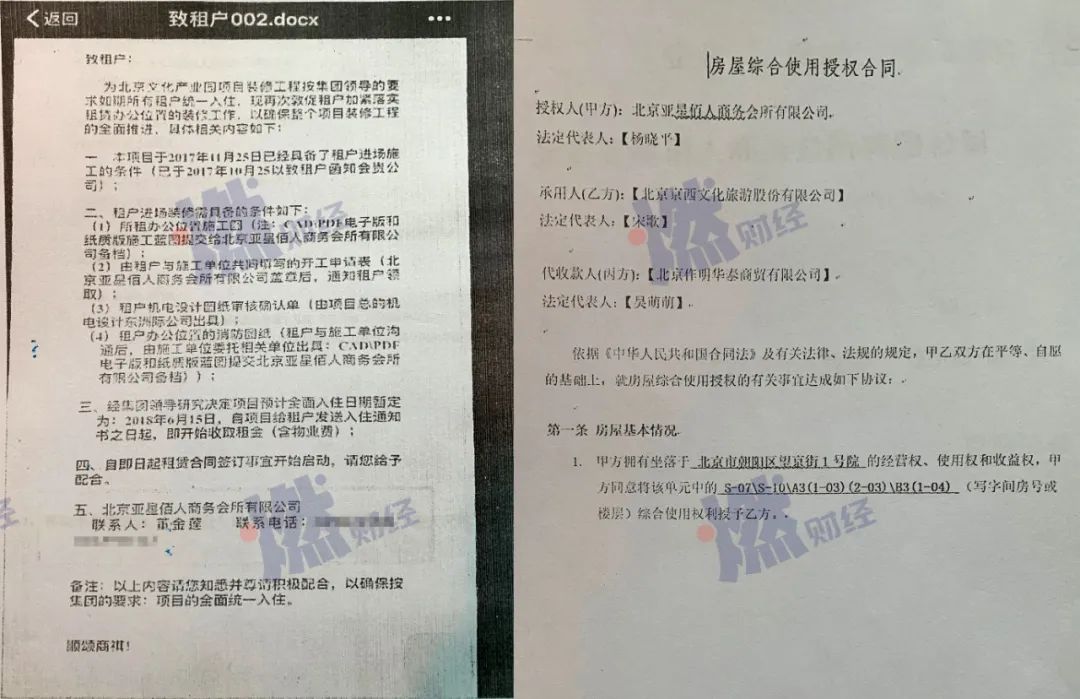 娄晓曦提供的“催租公函”和“房屋综合使用授权合同”显示,董金莲供职于北京亚星佰人商务会所有限公司,这家公司也是北京文化位于望京的办公楼的“房东”,而该公司的法人名为杨晓平。不过,目前尚无证据显示杨晓平与杨利平为一人,也无证据显示其与宋歌的亲戚关系。