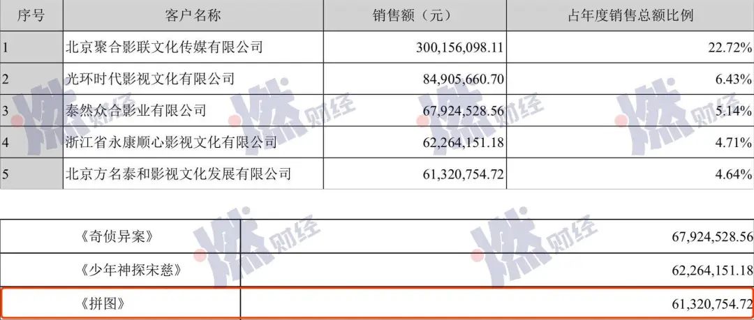 燃财经查询北京文化2017年年报,其中提到《拼图》为公司带来了6132万元的收入。而北京方名泰和影视文化发展有限公司也以6132万元的营收贡献名列当年北京文化的前五大客户之列。