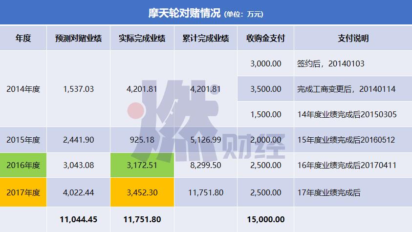 摩天轮业绩对赌的背景是:2013年12月,北京文化同意收购宋歌控制的北京光景瑞星文化传媒有限责任公司(以下简称光景瑞星,后更名摩天轮),交易价格为1.5亿元,但要分期支付。具体而言,签约和交割时分别支付3000万元、3500万元,剩下的8500万元则计划在2014年、2015年、2016年、2017年财年结束后分期支付,支付的条件是摩天轮要完成对应年度的业绩承诺。
