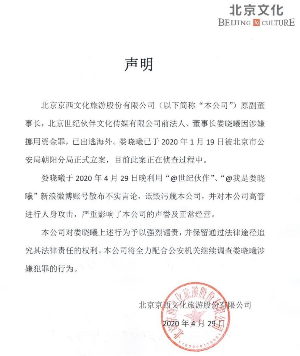 在娄晓曦发出“举报信”微博之后,北京文化给出回复声明。声明表示娄晓曦因涉嫌挪用资金罪出逃海外且娄晓曦已被立案。