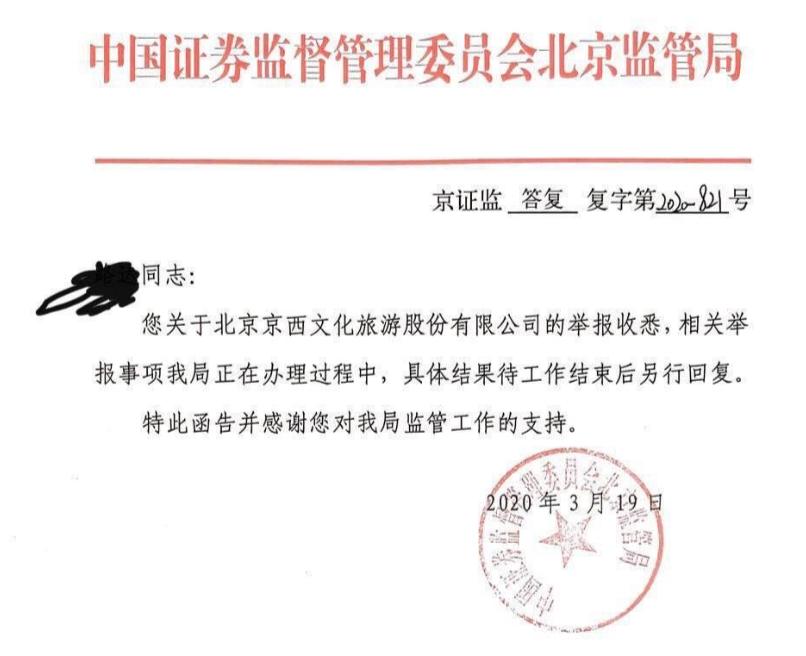 4月29日晚间,自称为北京京西文化旅游股份有限公司(北京文化)原副董事长娄晓曦的微博账号“@我是娄晓曦”,转发微博称:“本人实名举报北京文化系统性财务造假!举报高管宋歌、张云龙涉嫌背信损害上市公司利益罪,欺诈发行债券罪,违规披露、不披露重要信息罪,职务侵占罪!举报材料已获证监会受理。”