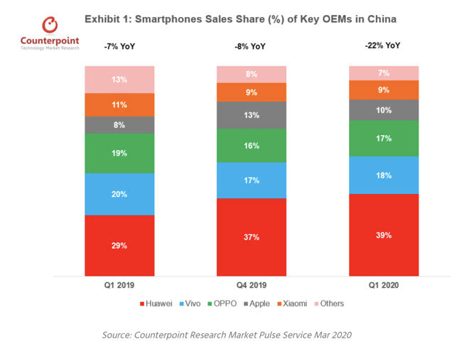 Counterpoint高级分析师伊桑-齐(Ethan Qi)解释说,苹果和华为的“市场份额都比去年同期增加了,在2020年第一季度的表现明显好于整体市场。华为智能手机的销量实现了6%的同比增长,iPhone的销量仅小幅下降了1%,而它们的同行则遭遇了两位数的销量暴跌。”