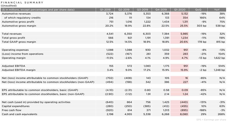 车东西4月30日消息,今日特斯拉正式公布了其2020年第一季度的财报,财报显示2020年第一季度特斯拉第一季度总营收为59.85亿美元(约合人民币423亿元),比去年同期的45.41亿美元(约合人民币321亿元)增长了32%。