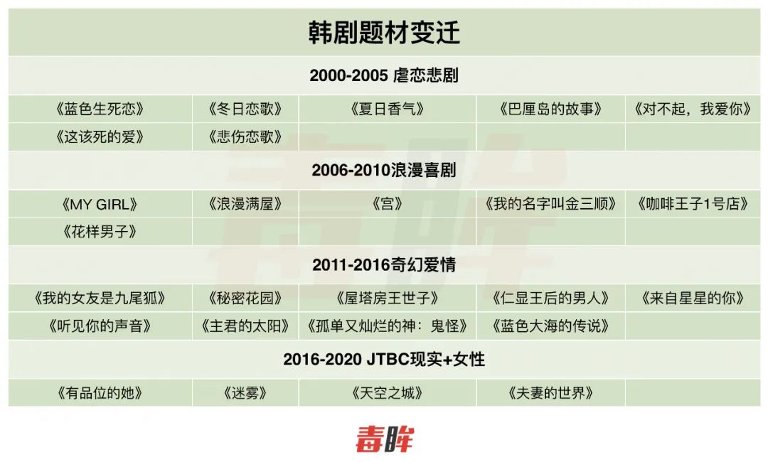 但韩剧审美疲劳的问题或许还轮不到中国观众操心:回溯过去20年,韩国电视剧行业总能很快地进行题材创新和转向,陈旧的题材濒临过时之际,新的爆款早已萌芽甚至涌现。