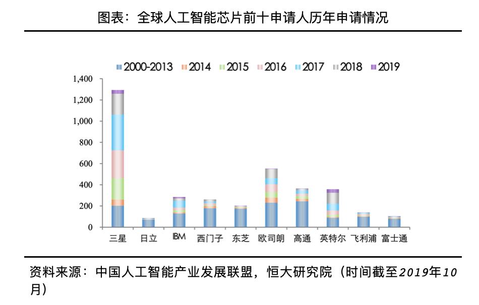 人工智能芯片的出现显著提高数据处理速度,支撑日益复杂的算法处理庞杂数据,是人工智能发展的重要基础。随着处理的数据量增多、从通用场景到各类特定场景,算法模型设计的框架和层数也越来越复杂,这对基础硬件提出更高的运算要求。从相关专利申请情况来看,中美两国是申请大国,截至2019年10月,中美两国人工智能芯片专利申请量分别为1.6万项和1.1万项。从相关申请人来看,传统芯片和半导体企业更有优势,其中三星、日立和IBM是该领域的前三专利申请人,从近年申请趋势来看,三星和英特尔表现更积极。从实际应用产品来看,目前具备代表性包括英特尔EyeQ系列、英伟达Xavier系列、华为昇腾310、寒武纪Cambricon 1M系列、百度昆仑芯片等。