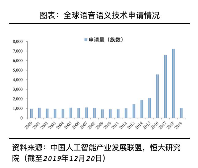 深度学习的发展推动人工智能基础应用技术突破,自2010年起,全球包括计算机视觉、语音语义等基础应用技术的专利申请量急速增长。