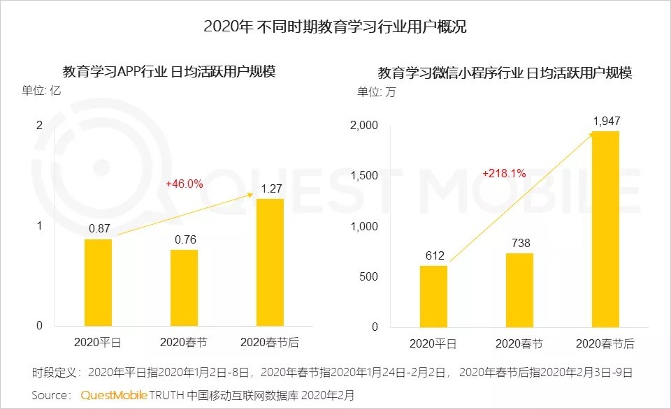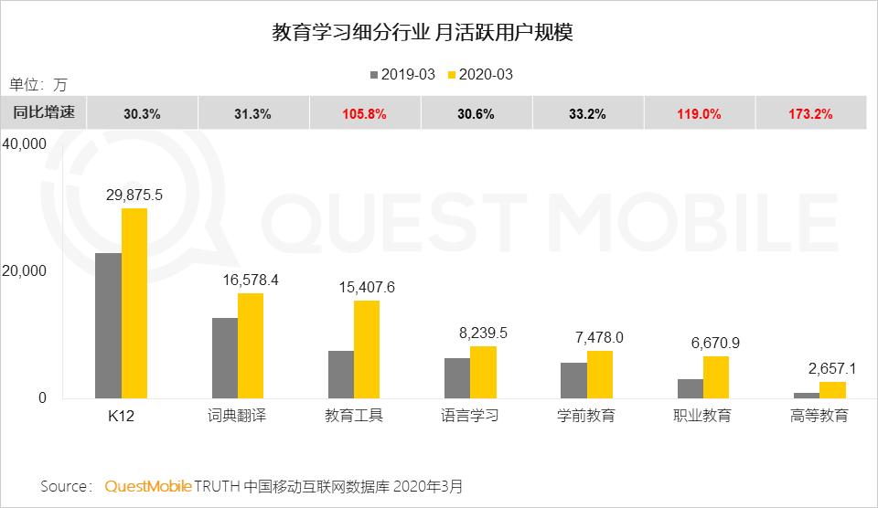 疫情的爆发让线上学习以前所未有的速度得以推进,用户渗透率快速提升。QuestMobile 公布的数据显示,2020年3月教育行业月活跃用户规模均出现大幅上扬,其中K12的用户规模增至2.988亿人,同比增速为30.3%。