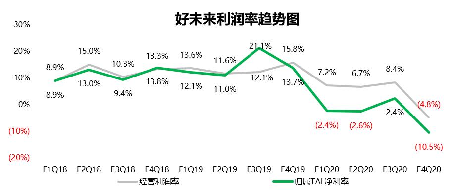 财报数据显示,2020财年,好未来经营利润从上年的3.416亿美元下降到1.374亿美元,降幅为59.8%。