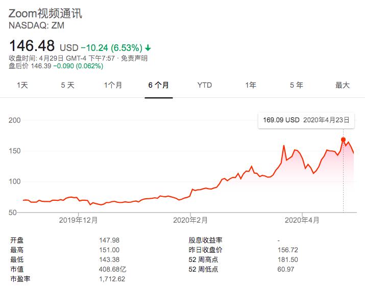 从今年2月3日起,因疫情带来的远程办公市场带动了Zoom股票飙升。此前Zoom的股价在80美元以下徘徊了4个月,经过一个半月股价就达到了164.94美元 (3月23日) ,市值翻倍。 哪怕在3月中旬,美股10天4次熔断创造历史时,Zoom也是一片红间少有的一点绿。