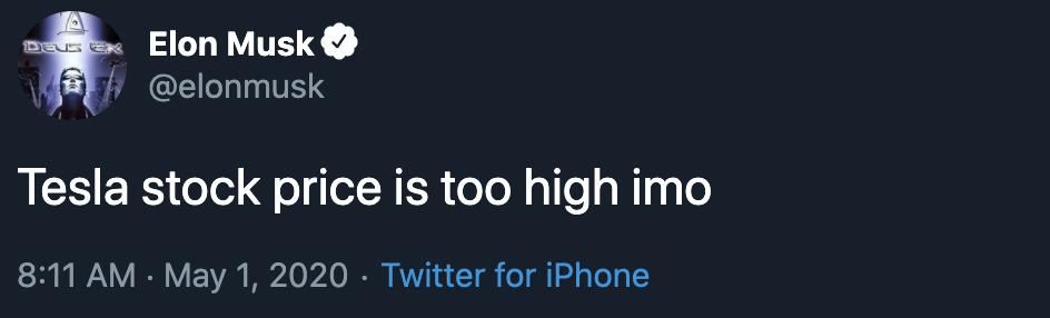 电动车厂商特斯拉首席执行官马斯克在毫无征兆的情况下,于5月1日美股开盘前在其个人推特上发文表示:“特斯拉的股价太高了”(Tesla stock price is too high imo),当天开盘后,特斯拉股价大幅下挫,一个小时内跌幅超过10%,市值蒸发140亿美元。