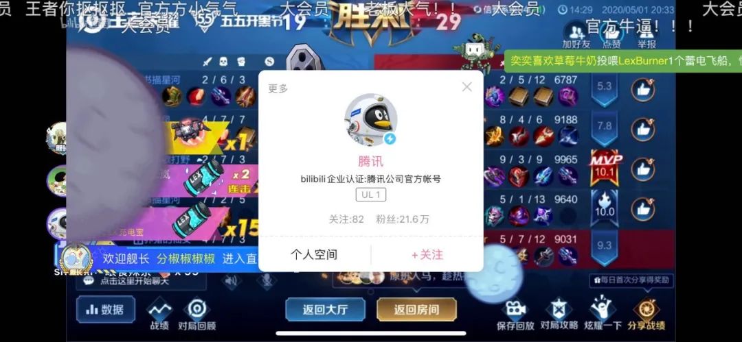 如此优质的私域流量,也让品牌方看到了营销宣传的好机会。阿里巴巴、腾讯、王者荣耀等品牌纷纷冲进Lex直播间,狂撒礼物蹭热度、求关注。哔哩哔哩大会员、漫画、游戏等组成官方全家桶,频频留言互动。