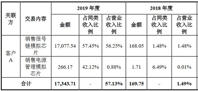 招股书显示,一家神秘的“客户A”2019年为思瑞浦贡献了1.7亿元的销售额,占后者总营收的57.13%。