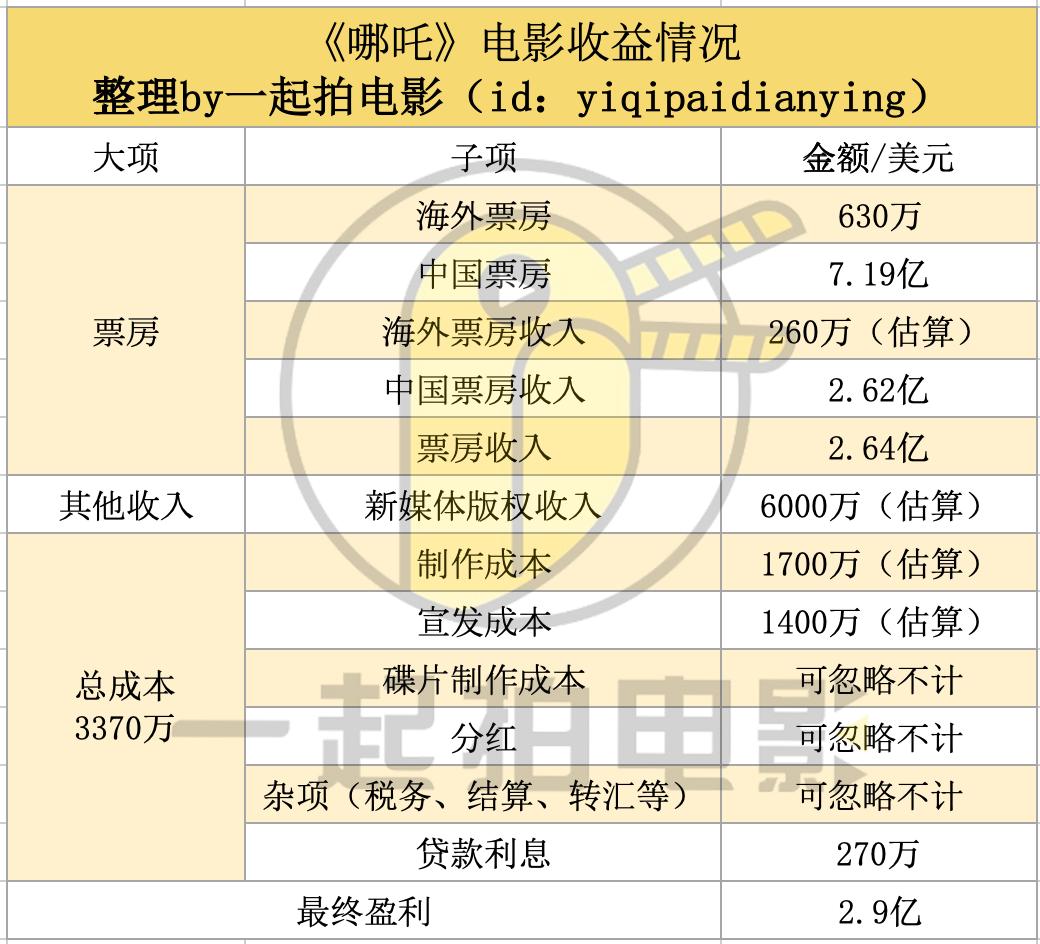 而与好莱坞不同,中国内地电影市场基本已经不存在碟市,此外也不会进行太多的外汇交易,同时也具有较为发达的票房结算系统,这些成本基本都可以忽略不计。最终按照目前通行的制片成本16%估算贷款利息与经常性费用,最终影片的总成本仅为3000多万美元,放在好莱坞市场中,可能连中等成本都算不上。但是影片最终却获得了逼近3亿美元的盈利,投入回报比逼近1000%,这对于一部票房10亿+的大体量影片来说,很可能是一个永远都破不了的记录。