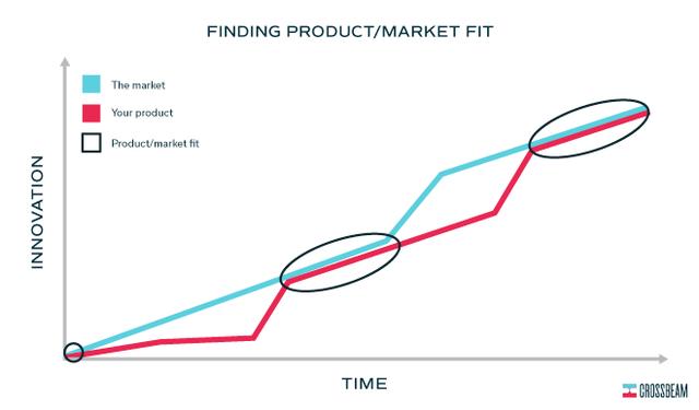 在RJMetrics公司,两条线在最完美的时刻贴合在一起,让我们创造出了许多价值。但随后,我们就迷失了方向。如果你长期保持原地踏步,或者在产品迭代方面没有跟上市场变化的节奏幅度,那你只会离产品市场匹配度越来越远。