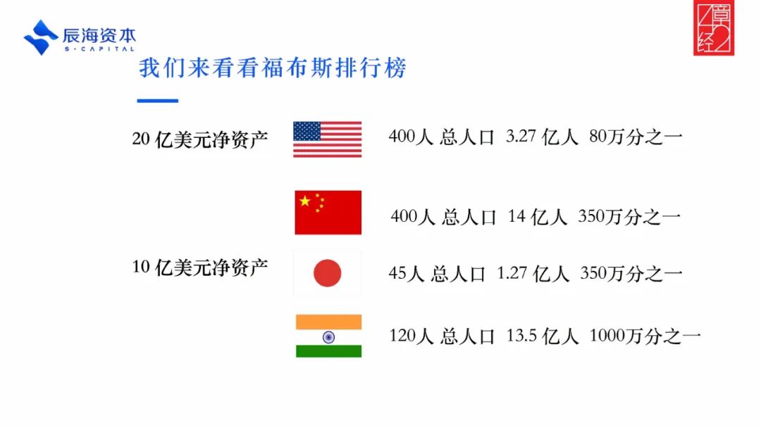 最后看印度。在印度有 120 人拥有 10 亿美元净资产,他们的人口总数是 13.5 亿,比例就是 1 / 1000 万。