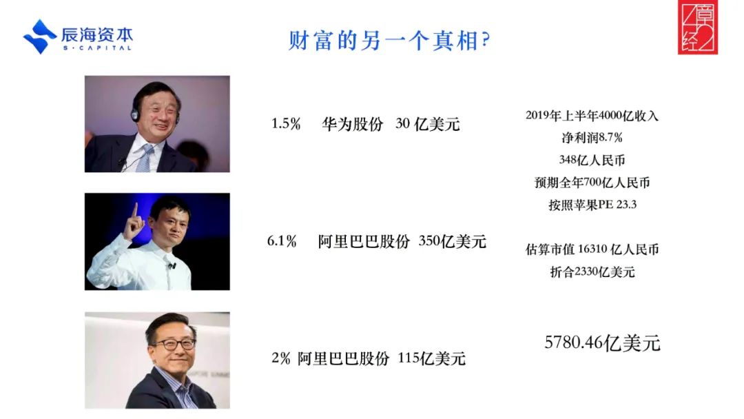 原来我们会觉得任正非创立华为、马云创立阿里巴巴,他们缔造了这么大的企业,做了如此有影响力的事情应该占有企业大部分的资源并拥有巨量的财富,但实际上的数值却比我们想象的要小得多,这是为什么?