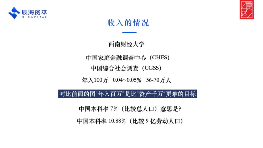 首先是西南财经大学的中国家庭金融调查研究中心(CHFS)每年都会做的中国综合社会调查(CGSS),其中有一个数据反映的是在中国能够做到年收入 100 万的概率是多少?这个数据是万分之四到万分之五,也就是说每年中国有 56 万人到 70 万人能够做到年收入达 100 万。