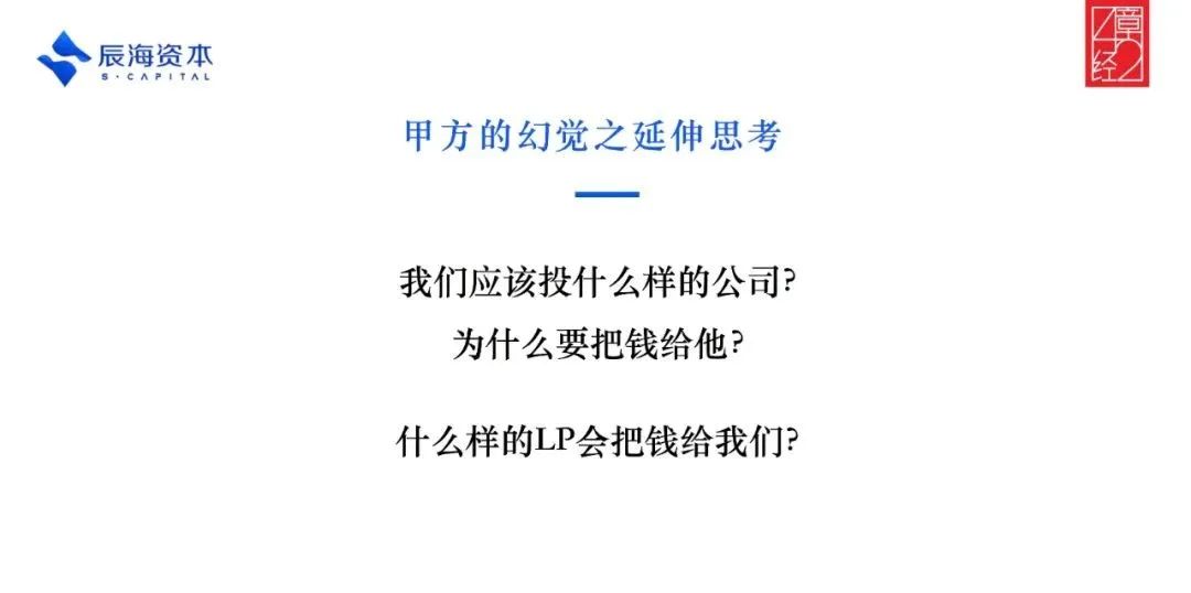 我们明确了自己是乙方,是做资产管理的,就是把对应的资产匹配到对应的钱上面,然后我们就应该思考到底要投什么样的公司?把钱给谁?