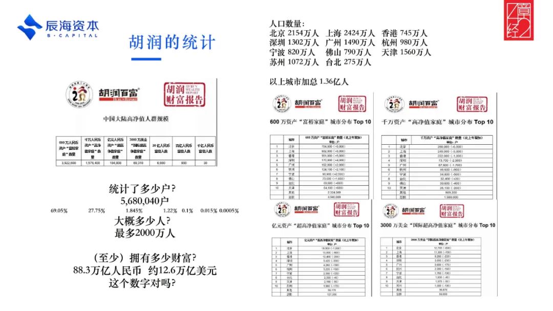 下面我们把视线放到国内,缩小范围,再来看看胡润百富榜。胡润百富榜每年会公布大陆的高净值家庭数量,以户为单位,这个净资产是要扣除债务的,就是算上房子价钱的同时要减掉背负的成本。