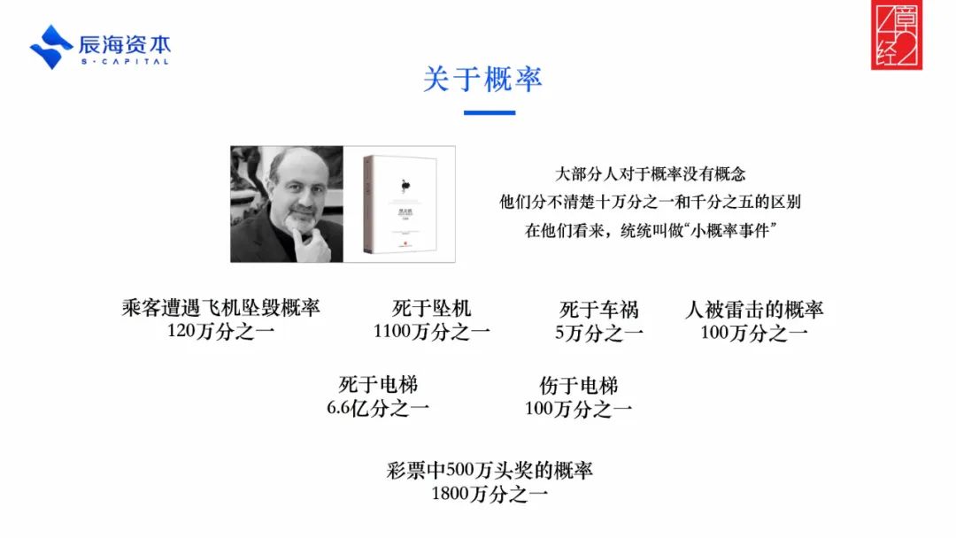 在塔勒布的《黑天鹅》里面有一句话是这样说的:“大部分人对于概率是没有概念的,他们分不清十万分之一与千分之五的区别,在他们看来这些通通叫「小概率事件」。” 我们单独的看 1 / 80 万 、1 / 350 万、1 / 1000 万 或许也没有太直观的感受,那么我们就需要一些其他的概率来进行对比。