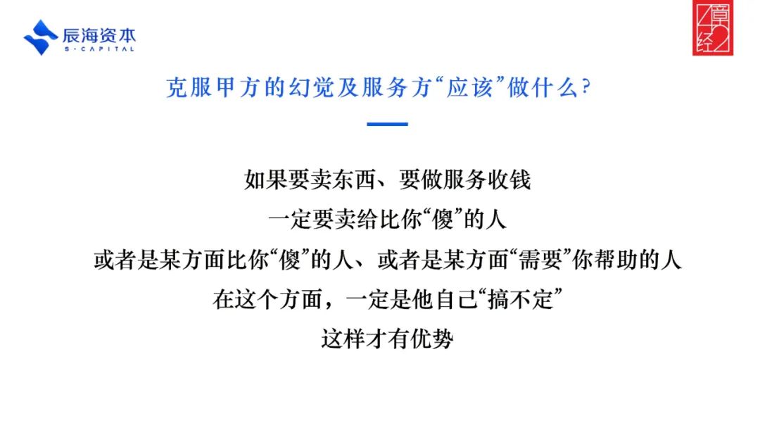 所以为了能够拥有源源不断的财富,就必须一辈子为之奋斗。我们需要克服“甲方幻觉”,并搞清楚什么事情是作为乙方的我们必须要去做的。