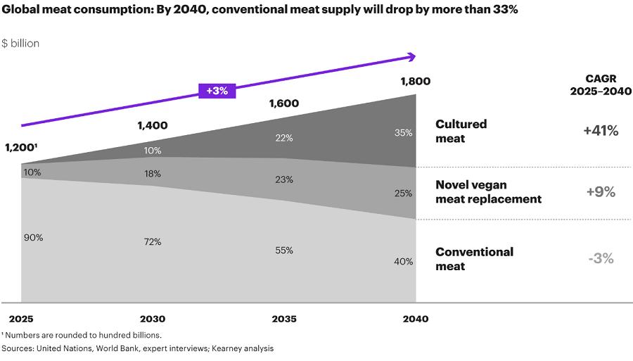 2025~2040传统肉、植物肉、人造肉全球市场份额变化预测