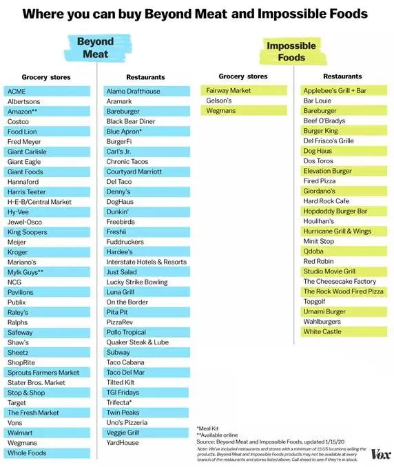 实际上,人造肉概念很早就有,经过十多年研究发展,2013年全球第一个人造牛肉汉堡被吃掉,随后欧美诞生了一大批相关创企和组织,关注度也是逐年升温,但目前还未真正走上货架,有预测称2022年有望正式进入消费市场。肉造人为什么还没上架,后面会再具体说。而植物肉已走在了前面,代表企业Beyond Meat和Impossible的产品已登陆各大超市与连锁餐厅,且下游合作队伍正在快速扩容中。受疫情影响,本年度植物肉在北美市场的销量或将迎来意外的喜人增长。