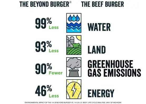 根据Beyond meat提供的数据,Beyond汉堡与传统牛肉汉堡相比,少消耗99%的水资源,少占用93%的土地,少排放90%的温室气体,减少使用能源46%。