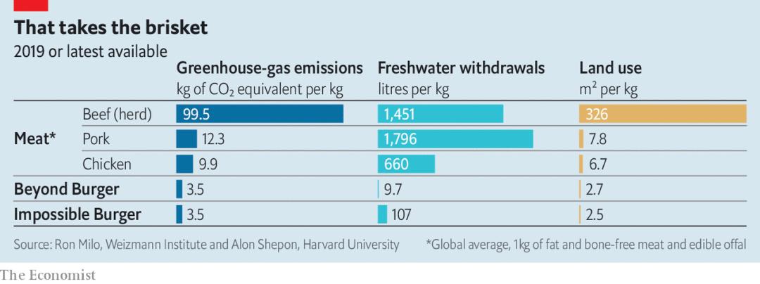 此外,经济学人也提供了一组比较数据,反馈了这一可持续性优势。Impossible的情况除了在水资源使用有所增加外,其他和Beyond Meat的数据一致。