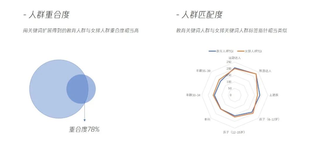 腾讯广告营销赋能中心洞察显示,K12受众人群与女排观众重合度高达78%,教育关键词人群与女排关键词人员标签高度相似,这是两者结合重要的基础条件,营销找对了人就等于成功了一半。