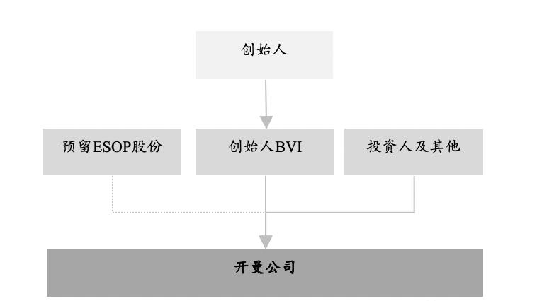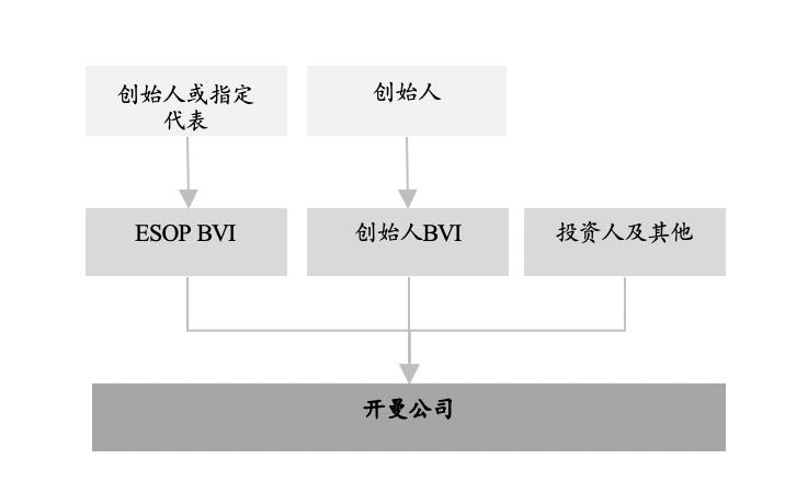 由创始人单独设立一家ESOP持股主体(例如创始人于英属维尔京群岛(“BVI”)另行设立的一家BVI公司,下称“ESOP BVI”),先由创始人名义持有该BVI公司的全部发行在外的股份,开曼公司向该ESOP BVI发行一定比例的股份,作为员工期权池。